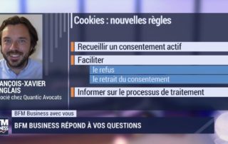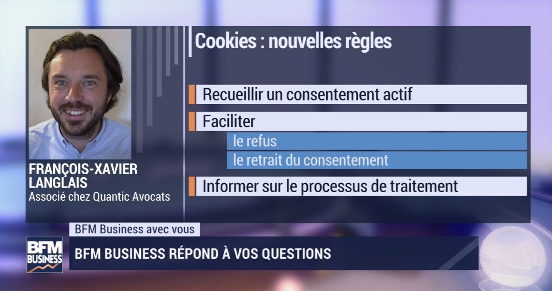 J'ai lancé mon activité de ventes en ligne pendant le confinement. On parle beaucoup de contenus au consentement aux cookies. C’est quoi le « consentement » en matière de cookies ? En attendant une décision définitive (de la CNIL, du CEPD ), que peuvent / doivent faire les sites internet ? François-Xavier Langlais, invité de BFM Buisness, vous répond.